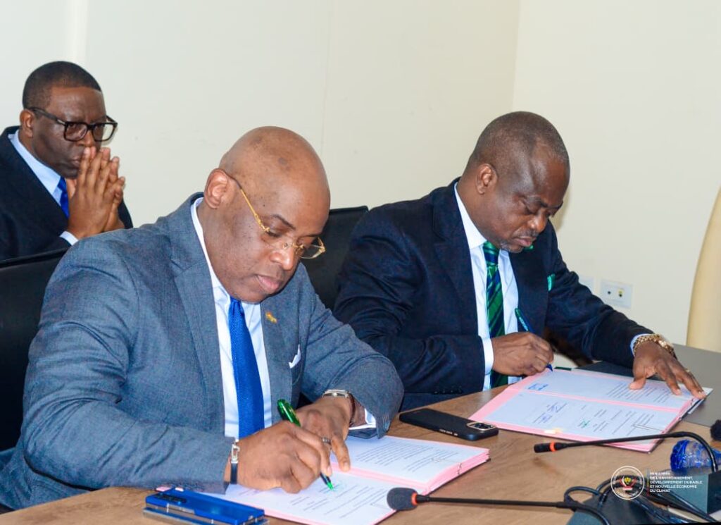 Le Fonds d’Intervention pour l’Environnement (FIPE) et la banque EQUITY-BCDC ont officialisé, ce vendredi 31 octobre 2025, un protocole de partenariat visant à financer des projets environnementaux en République démocratique du Congo. La cérémonie de signature, qui s’est déroulée à Kinshasa, a réuni le Directeur général du FIPE, Manassé Ngadie, et le Directeur général adjoint d’EQUITY BCDC, Hugues Efole, en présence de la ministre de l’Environnement, Développement durable et de la Nouvelle Économie du Climat, Marie Nyange Ndambo.